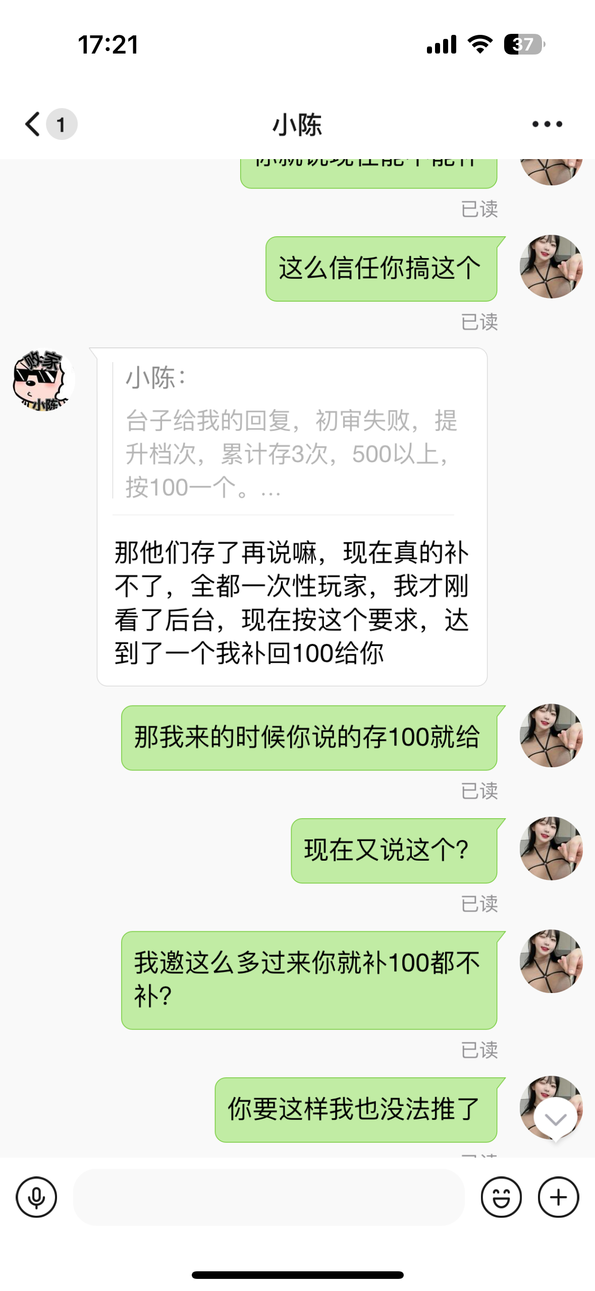 麻痹给他推半天一开始说一个充100给我30又说让我让他们冲到500才给我一个100到了也不给又说是刷子当时他们存100的时候不说不让我让他们存了存好了麻痹说是刷子跟傻逼一样两天几个人后台做了2万流水业绩最少在流水盘也有几百真傻逼