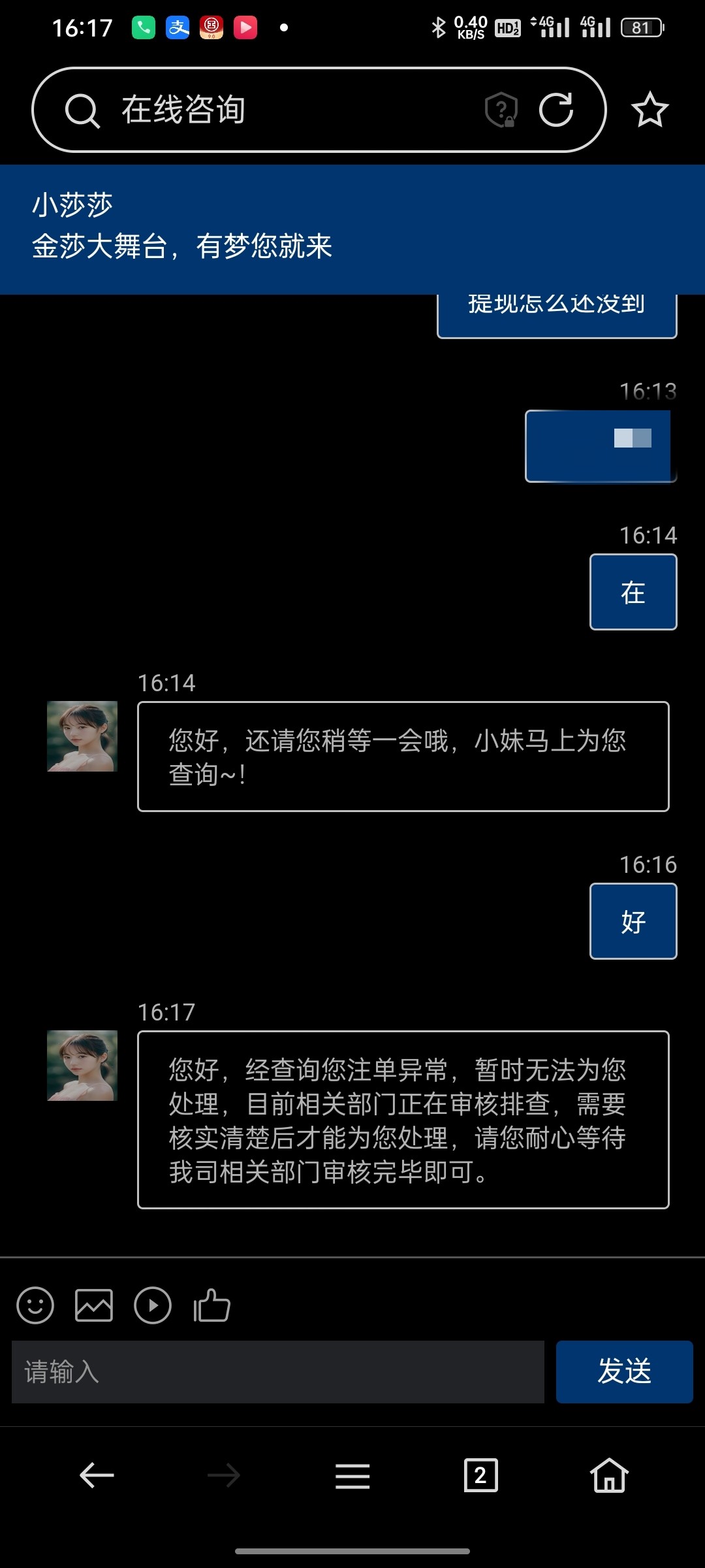 是的问客服的话就说排队出款中 今天白天又问了这次说我违规 我真无语了 领了20天了最后一次打成可1拉的麻将炸了204倍加上剩的分共225送回去25提二百那里也没违规 就是不给出而已 充值玩的提现秒到 说白了不靠谱了大家尽量远离这个台子格局不咋样