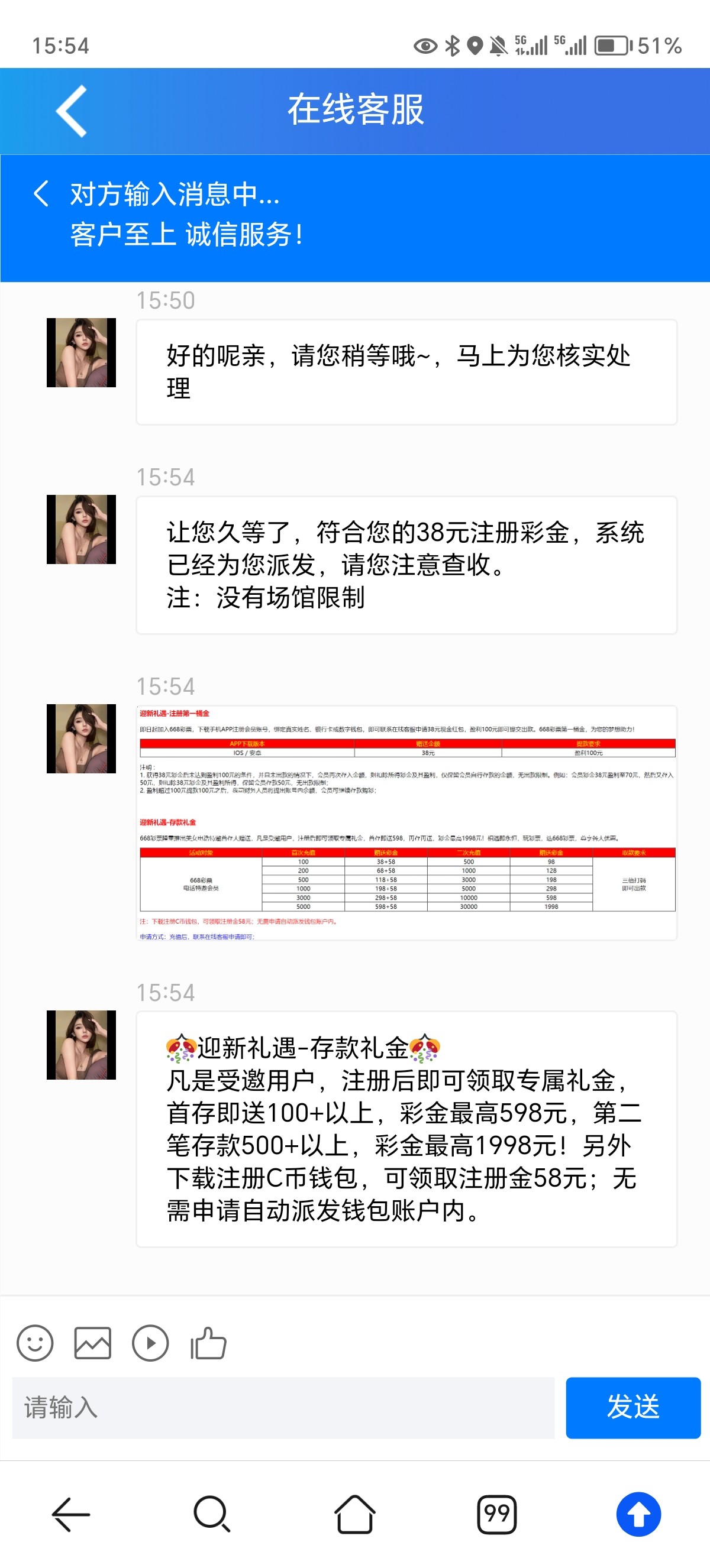 打电话说送38彩金,说一倍流水提现,打到了100提现直接封账号