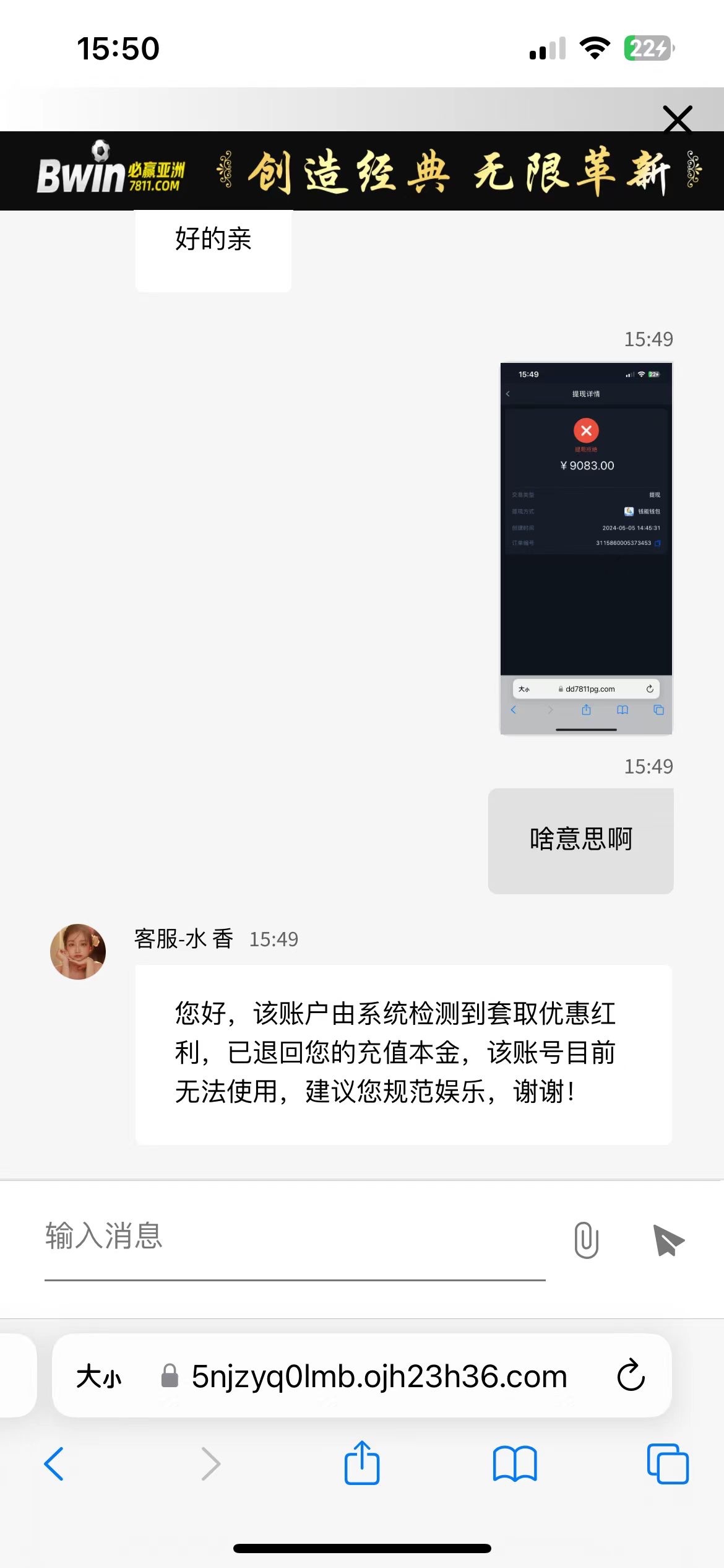 充了400没参与任何活动,玩evo真人的地产大亨豪掷千金赢了9000多,提款提了一个小时不到账,直接给我黑了封号,畜生平台大家千万一分钱都不要充呵。
