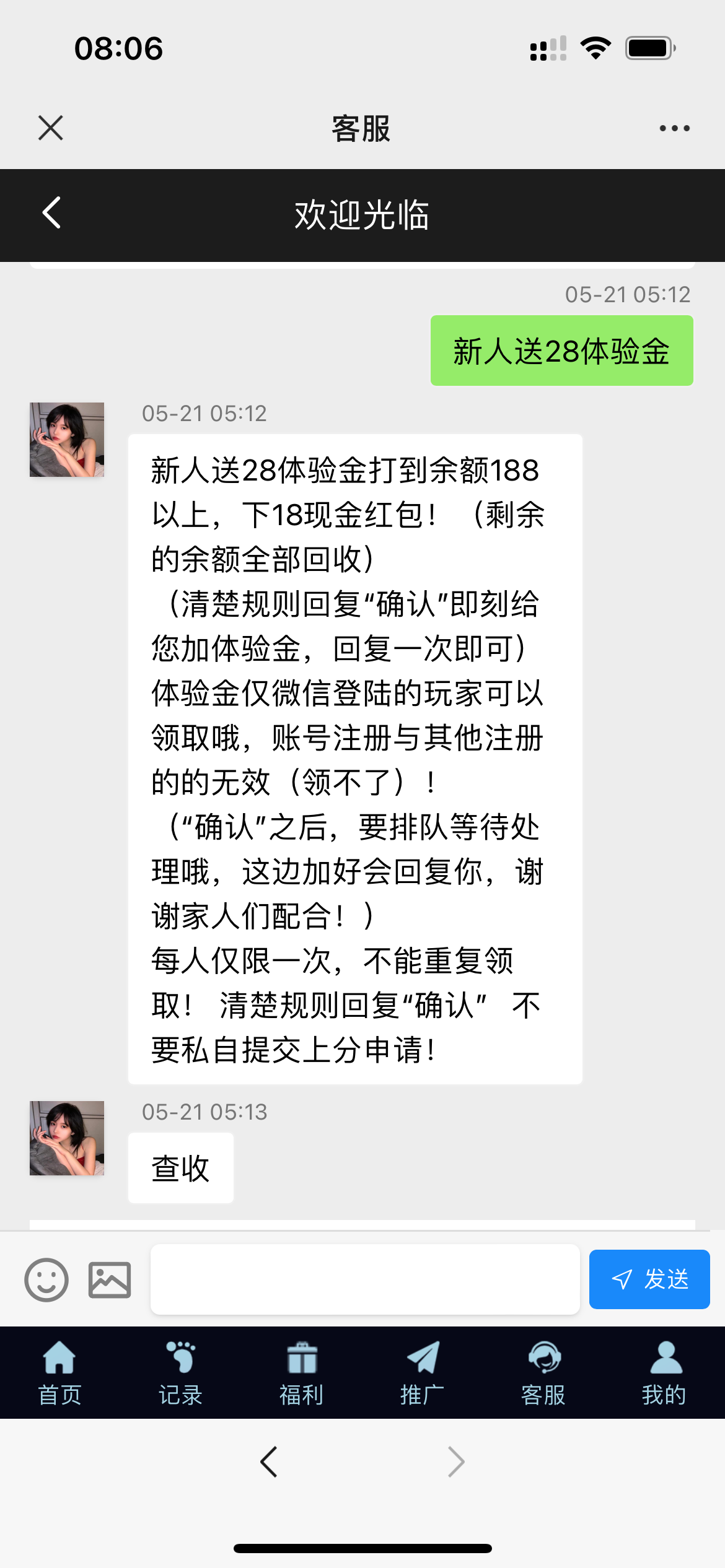 微信登录,在线客服点新人体验金,回复确认领取。28打到188以上,下18现金红包。
