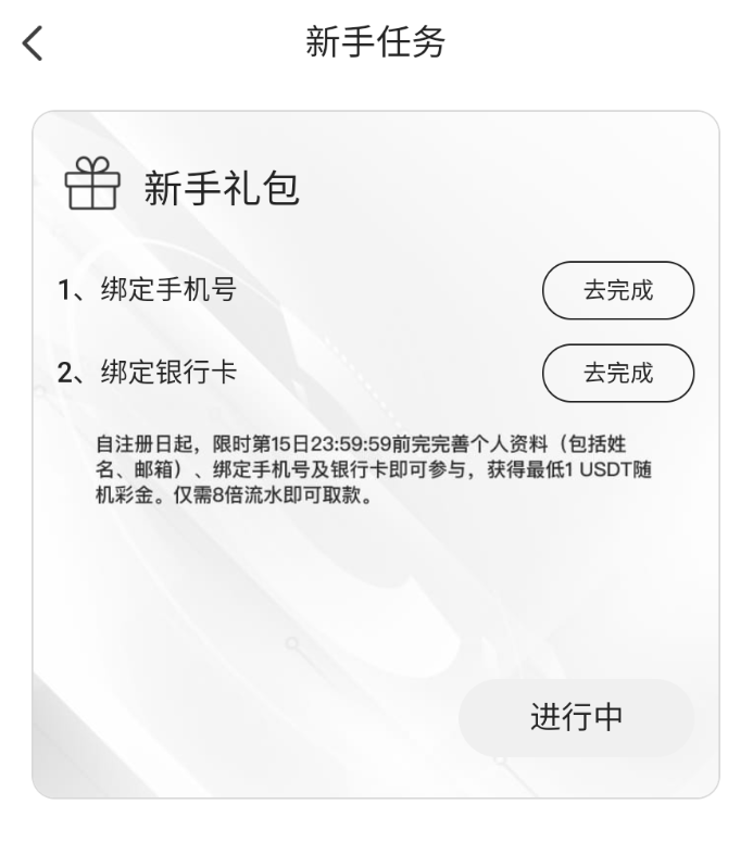 博系新平台好像,新用户注册去优惠往下滑有个新人任务绑定手机号银行卡秒领1usdt,最低14usdt起提,可以换成RMB玩,具体自测