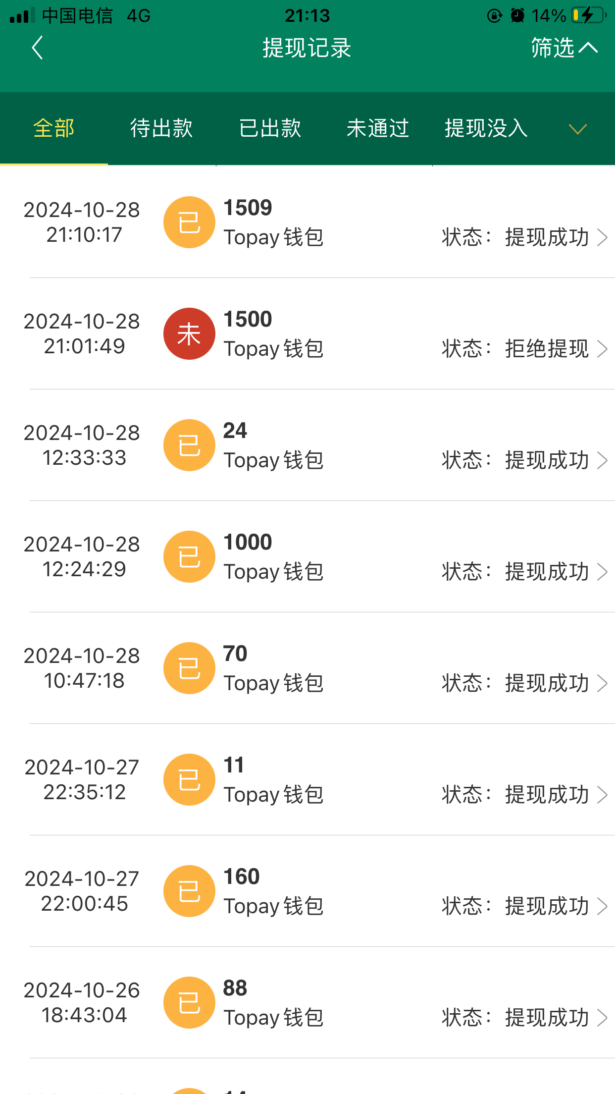 还好勾庄放我一马.不然亏炸了.充了几十打到一千五.提现给我拒绝了.找客服客服说我长期低倍打码就提现.让我打七到八倍水再提现.好说歹说让我这次提现了.以后再也不玩了.1336一点格局没有.