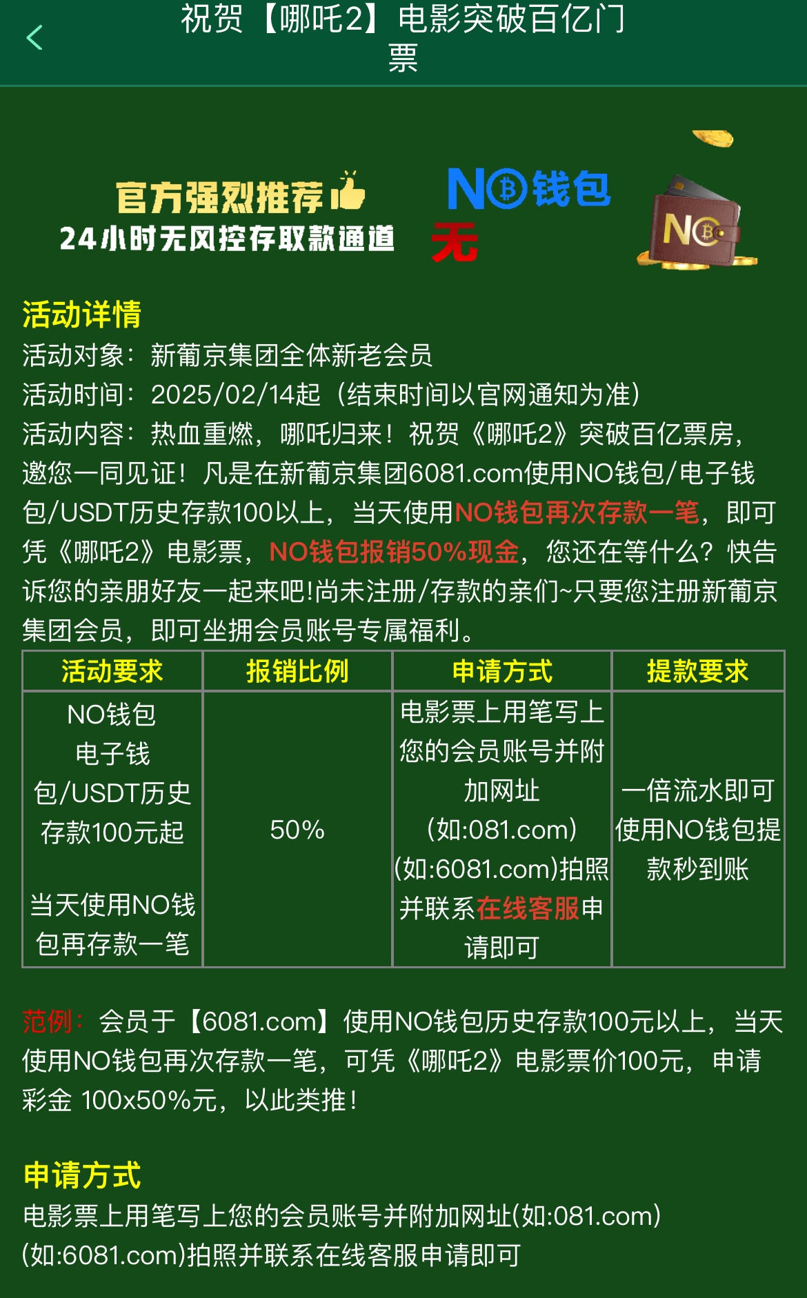 历史存款100以上,申请当天要用NO钱包存10即可,是需要当天的电影票,电影票上面写上他们这个平台的网址和你的账号拍照去找客服申请,可以报销50%,一倍流水!