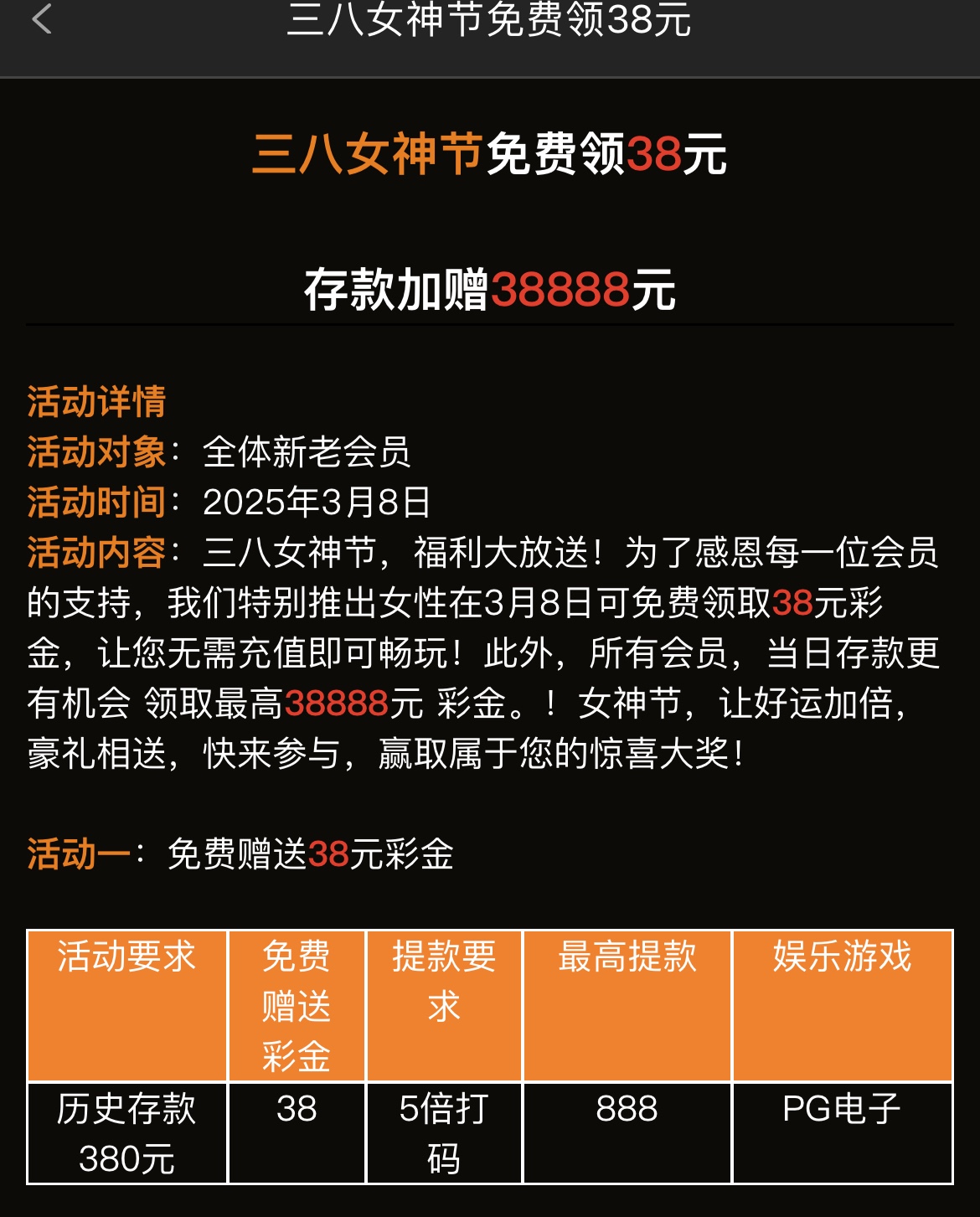 有历史存款380元以上的兄弟3月8号那天记得上号领38彩金,5倍流水/限PG电子,最高提现888元