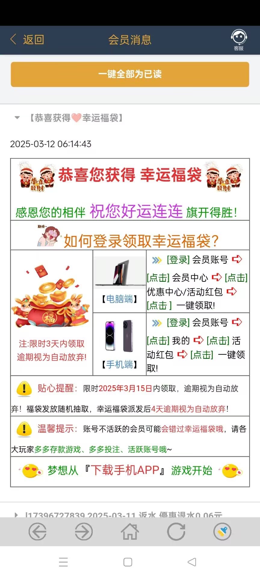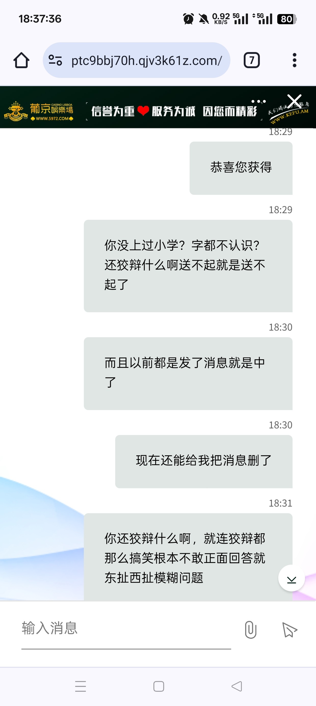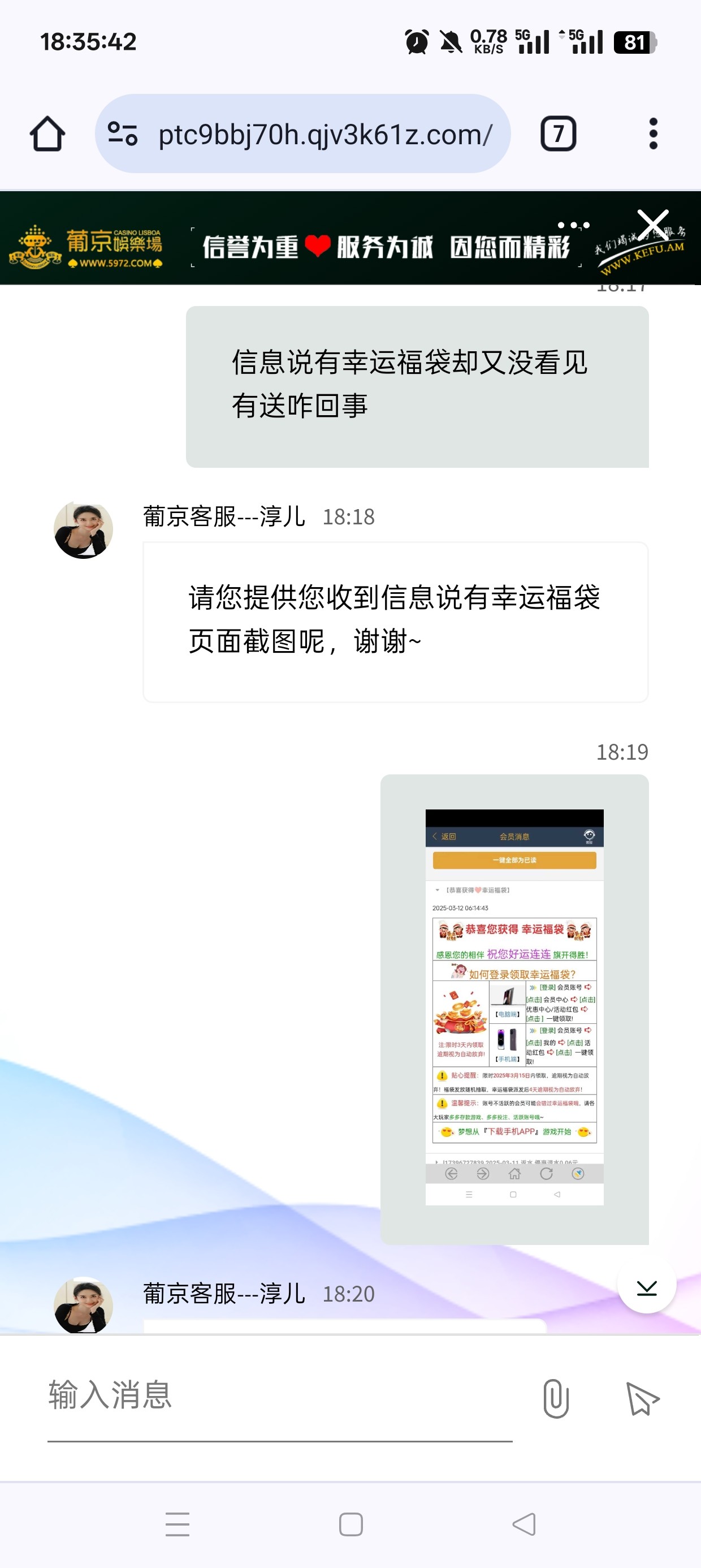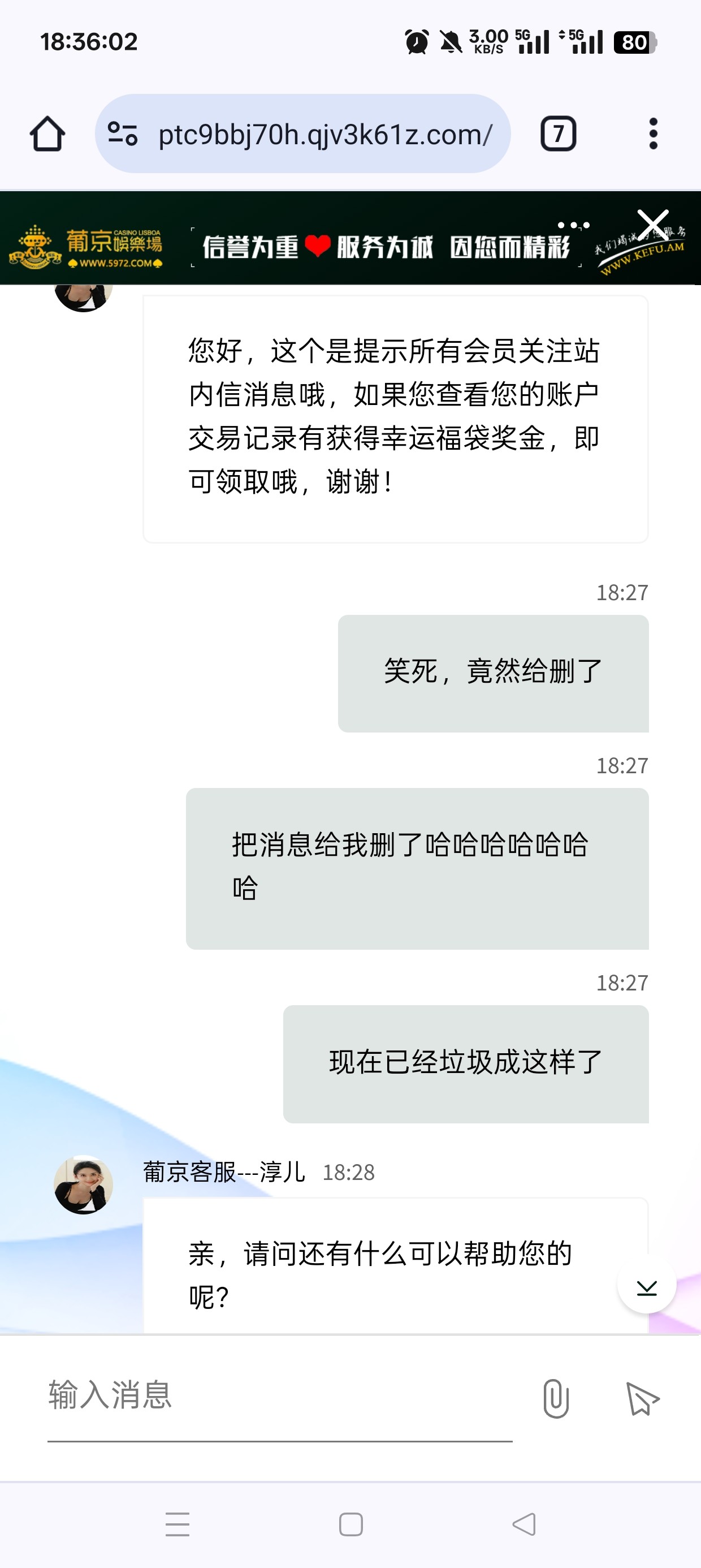 几年的杀猪台了,现在竟然连个彩金都送不起给我发的假消息,以前这个福袋送过好多次了,去问客服直接给我把消息删了还在狡辩,这个逼台子就是这样的每次一有问题就是不敢正面回答的,只会东扯西扯模糊问题自己的问题是不敢承认的只敢做不敢当,杀了我两年了估计看我现在这一两个月我不怎么送钱了连活动都是假的了,应该觉得把我榨干了没必要留我了吧,掉到v7了,我现在就充点维持着领个月彩金基本都是纯送打不出来的,觉得给我这猪杀干净了吧已经不把玩家当人了