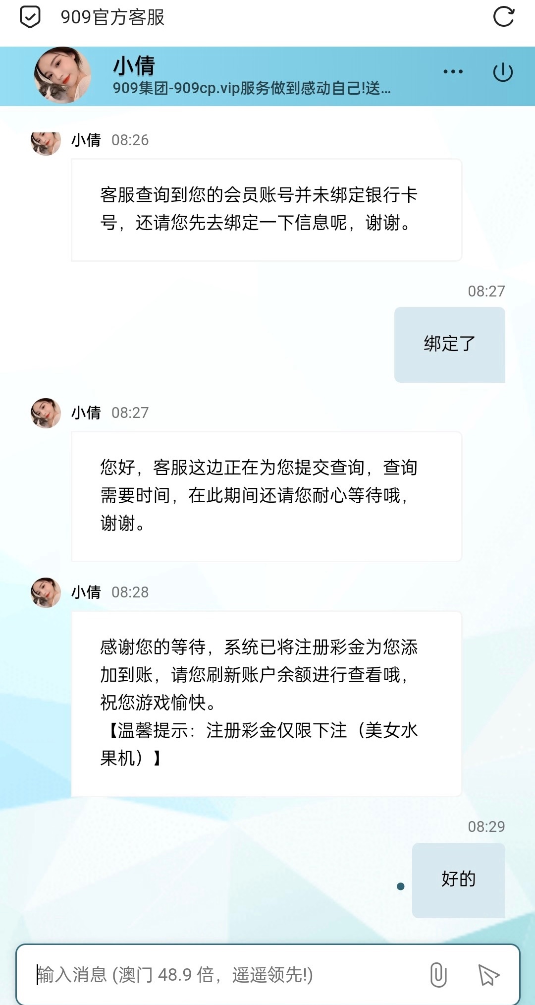 先打开六合宝典然后进入页面 有两个909一个是909彩票一个 往下滑还有一个909游戏 两个都可以申请 先截图进入链接注册后联系客服 领取18注册彩金 需要提供银行卡照片 介意的可以不要去了 限制玩美女水果机 10倍水