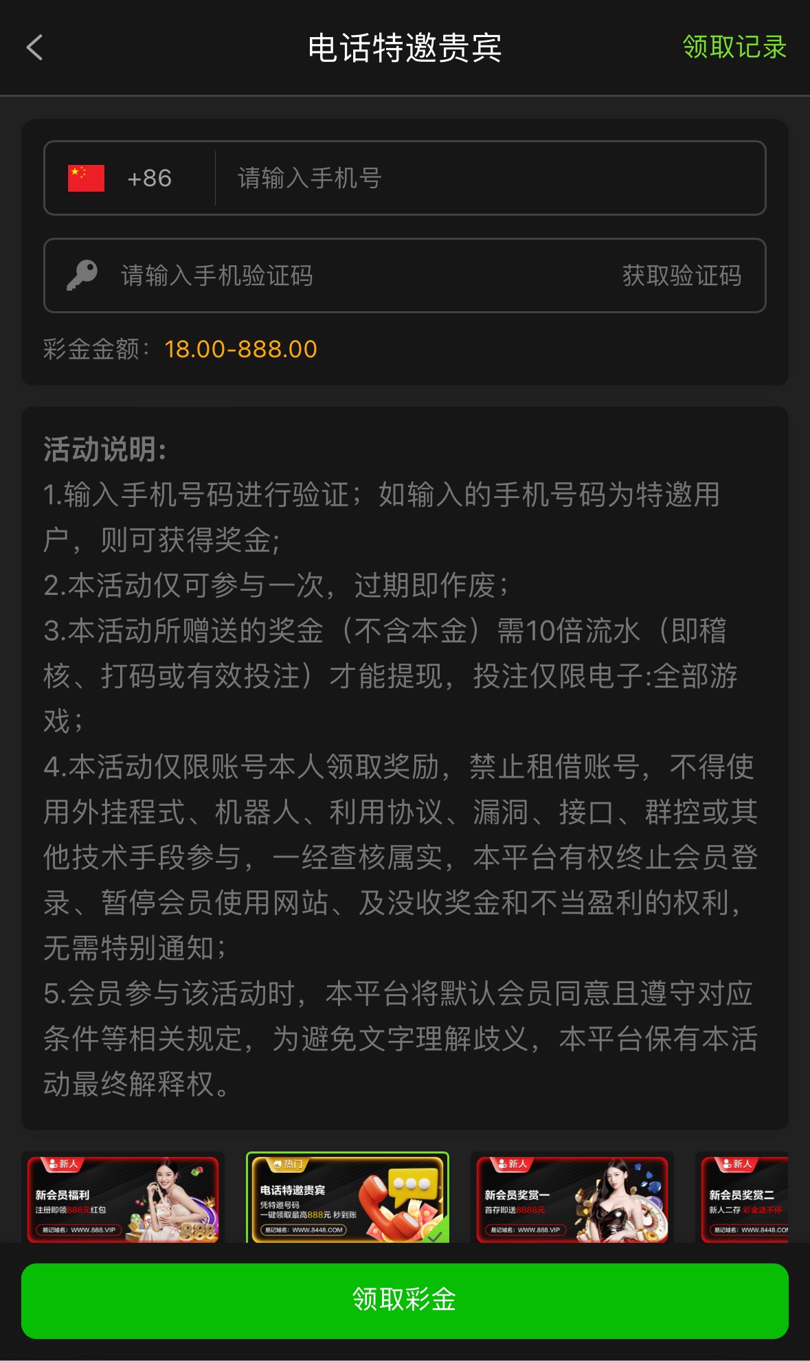 没玩过的可以去试试,注册完善资料优惠里自助领取彩金,10倍流水,仅限:电子