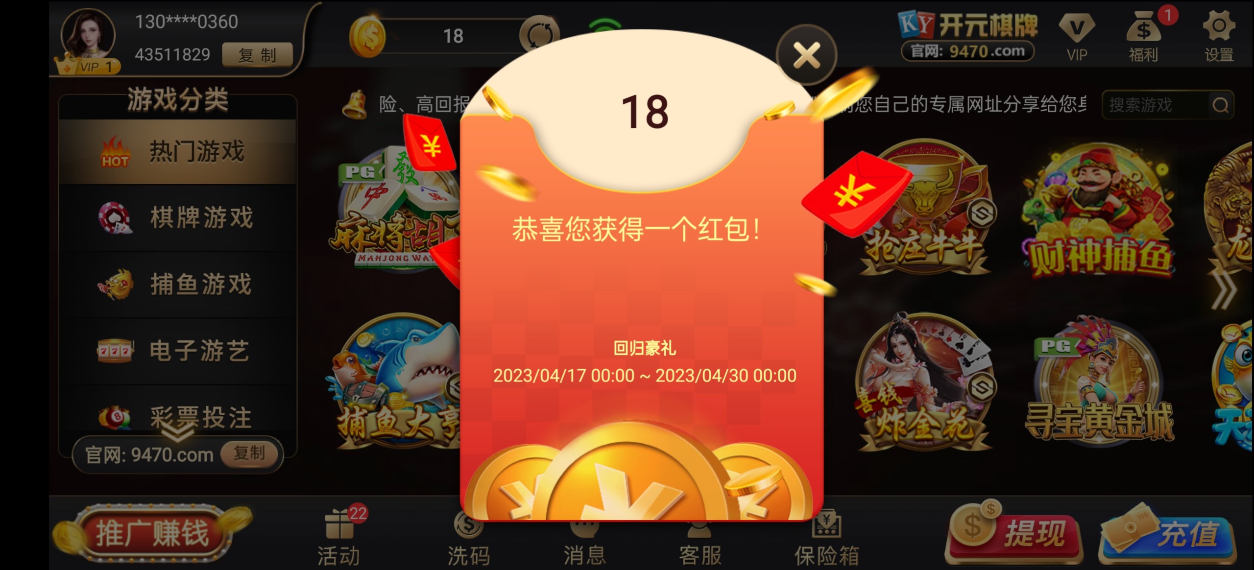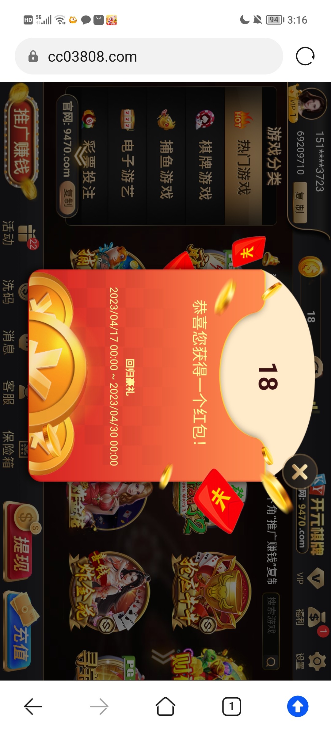有号的登录领18回馈彩金,我没任何电话短信也有。