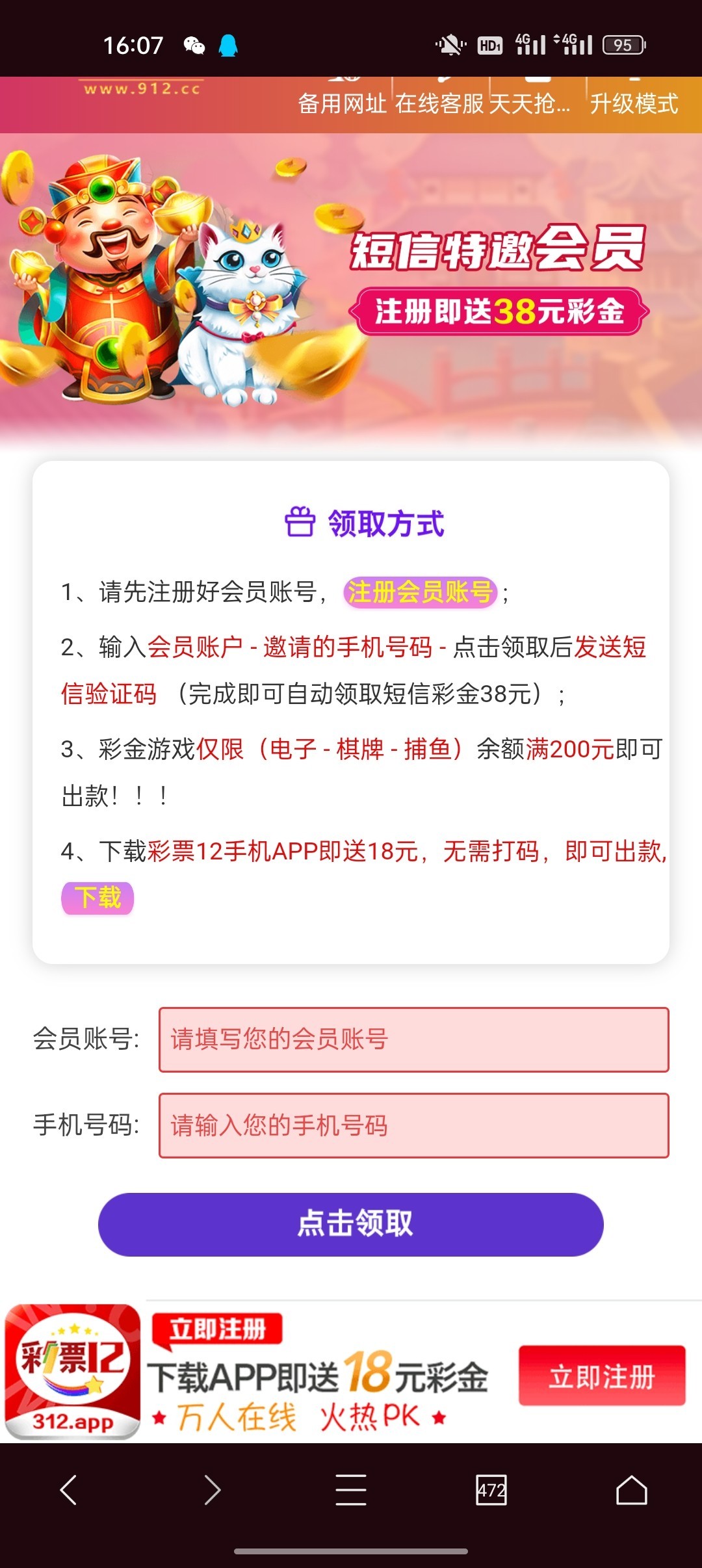 进网站随便输入一个账号 再输入自己手机号 是特邀的话再去注册 特邀碰瓷都去试试 还有下载app彩金 游戏和提款限制自行查看