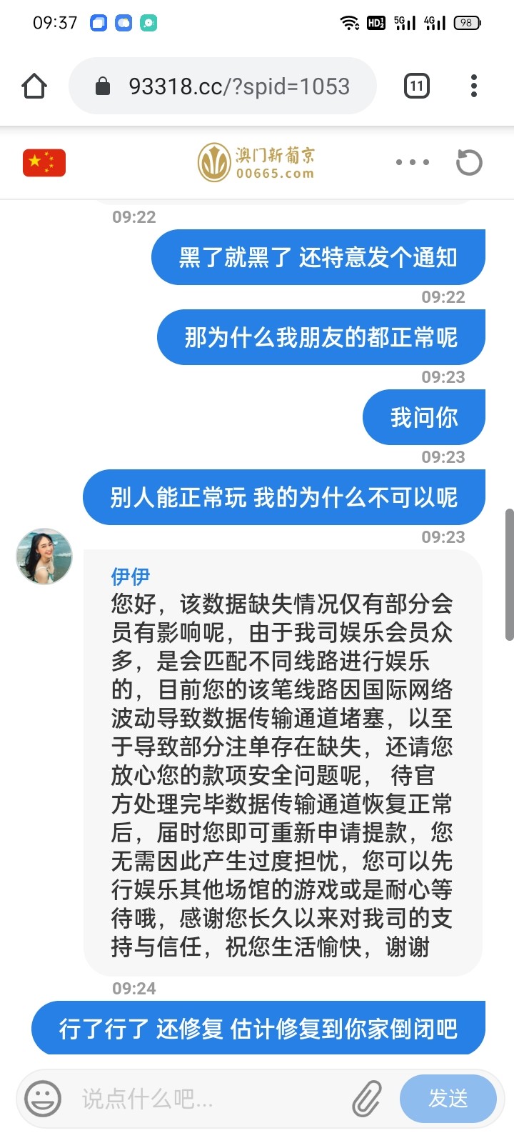 一直玩着的 也充过差不多有10w了     前天140反水优惠上2w黑了  找理由了