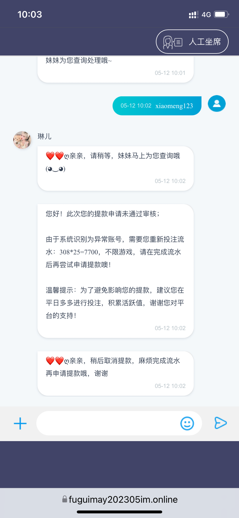 充值的,提现308说异常账户,直接退回说让打25倍流水,打挂了,有二十多返水,我又打到了两百提现,直接封,说我不正常游戏,全程玩电子说我不正常玩,球友会真是充值不让你提,返水直接封
