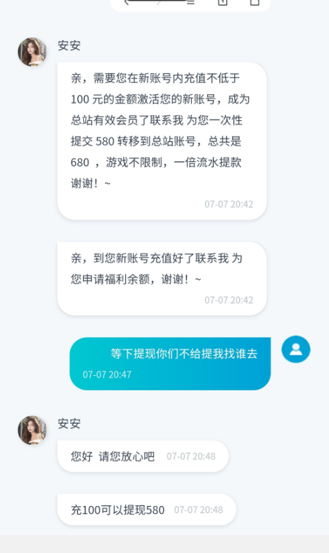 充值一百假装查一下然后再找个借口让你冲300!再然后让你打一倍流水!怎么打怎么输