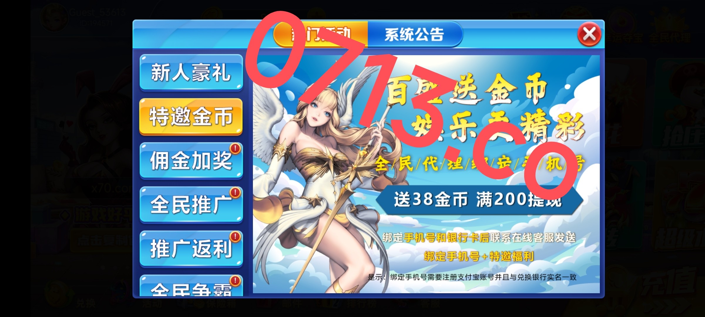 新用户注册送8 特邀送38 注册绑卡联系客服申请 绑定手机+特邀福利 没碰到的可以去玩捕鱼打到10可以去玩其他的!最低100出!特邀碰到的要打到200才能提!提现要是退回的话“可以试试充值10打10流水重新提”要是在退回可以问问客服!要是黑了就是亏10块 出了那就赚了!自测吧!(反正我没碰到注册送了8打捕鱼打到12去玩破冰行动没了)(贪玩系列的)后续收到短信也可以申请特邀!