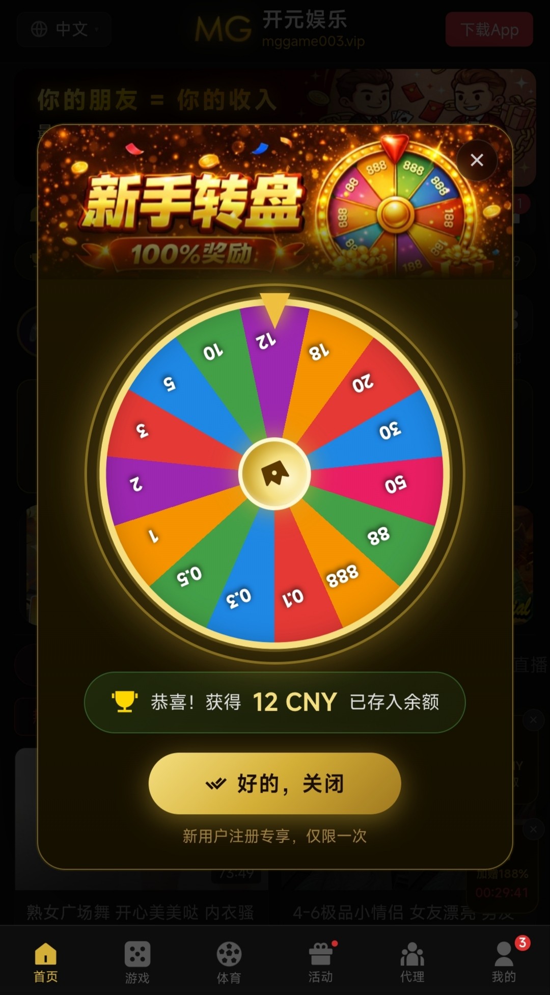 注册好后会有一个转盘弹窗出来,点击转动即可,优惠里有签到彩金跟新手任务彩金